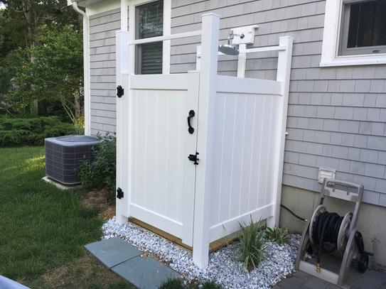 Liquid Sunshine 3 5 Ft W X 5 Ft H White Vinyl Outdoor Shower Stall Gate Kit Unassembled 73025338 The Home Depot Outdoor Shower Kits Outdoor Pool Shower Outdoor Shower Enclosure