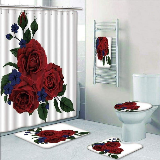 Prtau Rose Blooming Red Roses With Gentle Wild Flowers Leaves Bouquet Corsage 5 Piece Bathroom Set Shower Curtain Bath Towel Bath Rug Contour Mat And Toilet Lid Cover Walmart Com Walmart Com